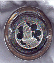 The Praying Hands one ounce silver round is featured in this beautiful heavy duty glass dome paperweight. This different kind of paperweight would make a practical gift for your dad or mom, aunt or uncle, grandfather or grandmother. The uncirculated coin contains one ounce of pure silver. The thick high quality glass dome is 3 inches in diameter with a thin layer of cork attached to the bottom to prevent scratching.