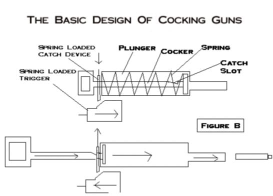 It is really sad actually. People just open the gun with out any idea what they are doing and waste themselves 15 bucks. So you never have this problem, here is the basic design of cocking weapons. The Basic Design of Pumping weapons will be along shortly. First, NEVER open a good gun unless there is a reason to mod it. One time i just wanted to take my Big Bad Bow apart and lost two springs. The gun is ruined and I can't find a replacement spring. What you need to do it open the gun, then look at the placement of everything before taking a single thing apart. Then slowly, peice by peice take everything out and do what you need to do. Most mods are imposible to do with all the guts still in the gun. What you want to do now is either find something that is restricting air and take it out, make the spring compress better (The SharpShooter II), or even replace the main spring with a thicker one. Always remember that pump guns are easiest to put back together, because there are less springs. Good luck.