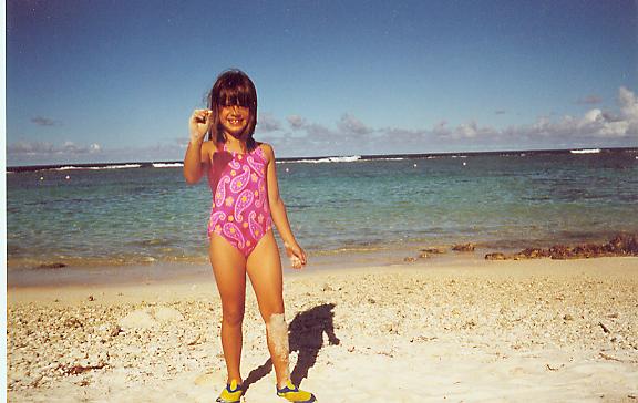 LittleKitty is nuts about collecting shells. She tries to collect hermit crabs, too. We always manage to leave them on the beach where they belong. This was taken at Taragaue beach in October 2002. |