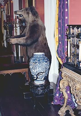facing windows and two 17th century carved oak fireplaces. Two European Brownbears (each standing approximately 6 feet 4 inches tall) flank its entrance. Among the treasures ondisplay here are two giltwood console tables; their swagged garlands are richly carved and very similar in execution and design to a table made for the Royal Palace in Warsaw. A pair of marriage coffersin buhl work, displayed on stands in the same medium, are stamped Béfort Père. |