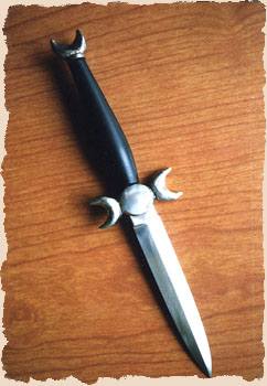![]() Kris Cutlery The “Skean Dubh” is a small Scottish dirk popular around the 1800's. The single edge 5" blade has the typical series of file marks along the top. It has a 4 1/2" Macassar ebony handle studded with equally spaced brass pins for a better grip. Solid brass pommel is threaded to the blade tang. Black leather sheath. Overall length, 9" COST = $45 |