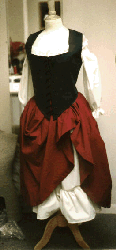 ![]() (B) Country Maid Skirt with Integral Bodice. Bodice and attached skirt made of durable 100% cotton. Bodice is laced to fit with brass grommets, and full skirt is split down the front to show a modest peek of muslin underdress (see C). Sizes Sm., Med., Lg. or XL. Choose Black, Red or Emerald Green. $70 |