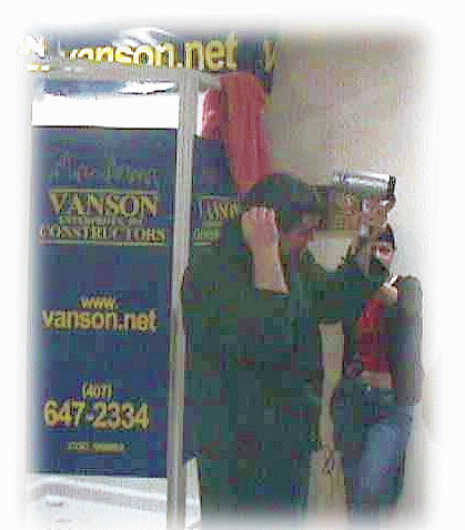 Kevin directed Jacob (singer/keyboardist) to mime the words to the song "Send Love and Warning Lights" backwards (!) and to walk backwards through the whole video, while Justin (guitarist) myself, and others were doing various "scenes" in the different areas, as Kevin moved continuously with the camera. Then he played/rendered the video backwards, so Jacob appeared to be doing his parts & walking Forward, while everyone else was in reverse. If I hadn't been there to see Jacob going backwards throughout, I would not have been able to tell he did that, from what I saw later. It was incredible watching this, even the roughs & outtakes. The video was done in one swoop --no editing together parts--. with only time for 3 full takes, as there was a show at the club scheduled for later. I still can't get over how Kevin steadily and quickly maneuvered the camera through all the scenes without stopping!