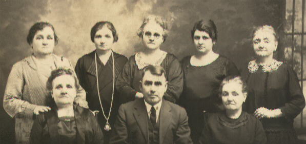 Back Row: Wilkie Frost, Florence Burns, my grandmother, Mary Smalley, Myrtle Burd, and Nellie Casey.