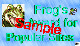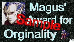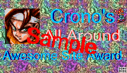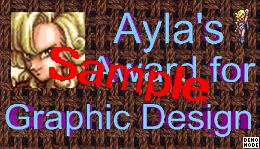 To qualify for this award, your site must be CT related (duh) and have a lot of CT Artwork or pictures. The more the better. This is an award for any page where you can find tons of pictures related to Chrono Trigger. They can be fan pictures, official artwork, icons, etc. Another thing that looks impressive for this award, but doesn't necessarily decide it, is your own artwork, animations, and backgrounds found on the page.