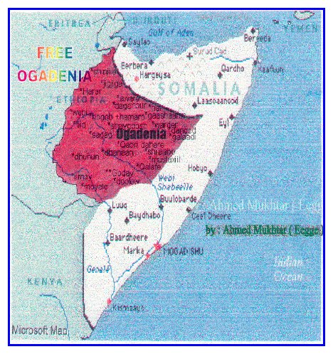 OGADENIA..Is arid upland in south eastern Ethiopia bordered on the north and east by somalia the ogaden population is primarily somali, a muslim people under EVIL ETHIOPIAN COLONY. the region was occupied by ethiopia 1n 1891 and in 1936 was incorporated in the colony of Italian Somali land. In 1941 it was occupied by British, who returned to Ethiopia without consent of ogadenian people who are right full owners of this land in 1948. Since 1960s Somalia was disputed Ethiopia's claim to OGADEN and liberated the OGADEN REGION in 1977-1978. The Soviet union and Cuba started a massive airlift to Ethiopia about 61,000 tons of latest war machinery, where transported to Evil Ethiopia there are also 60,000 Russia and Cuba compat units deployed to Ogaden Land to help the weak Ethiopian army to cutch back the Ogadenia Region. The somalia military was defeated which is disaster for Ogadenian people All people have the right of self-determination. One day Ogadenian people they will get their FREEDOM. Insha'allah !!!!!!!!!!!!!!!!!!!!!!!!!