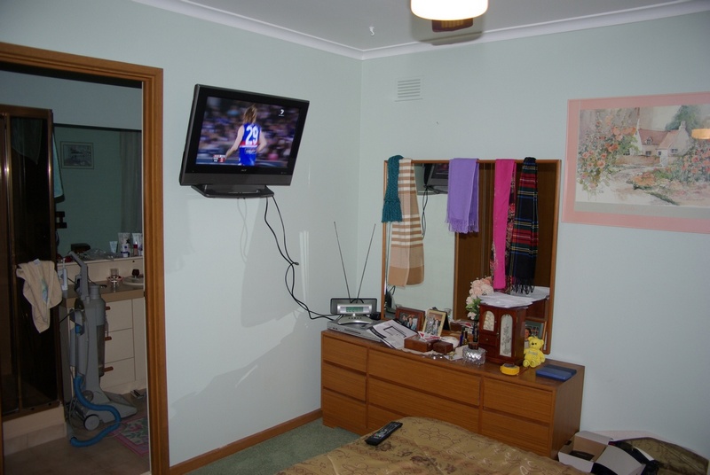 | This was my big achievement for the day. I managed to bore holes into the wall and get this TV frame bolted firmly. Then we lifted the TV onto the frame and screwed it all together. The DVD player you gave us is ready to connect but I have to get slightly longer leads first. The TV actually swings out and can be turned in any direction. But so far, it's OK against the wall. We can see it clearly in bed. | |