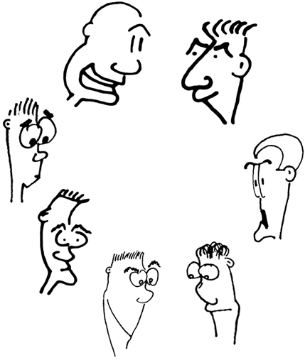 Subject: | Various cartoons drawn in classes my junior year. Clockwise from right, "Orange Hair", "Big Nose", "Devious Grin", "Banana Head", "Assertive", "Old School", "Wavy Hair". | |