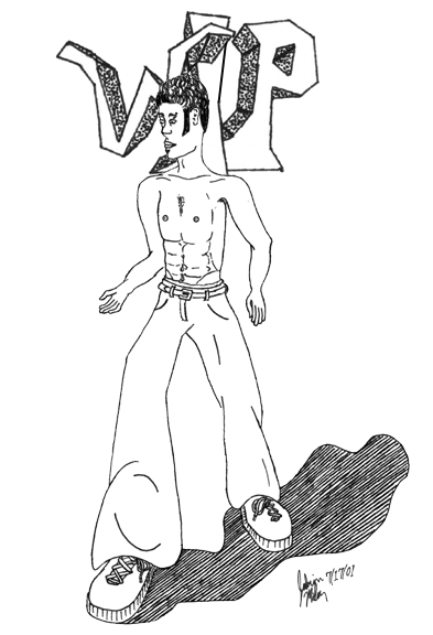 Subject: | A guy who's supposed to be sexy. I drew this one at the gas station after the third Liero fan art. I like the legs and the shadow, despite the fact that I couldn't figure out a way to draw the fold at the crotch so that it looked like his right leg is forward. The legs are supposed to be in defiance of perspective. What I don't like, though, is the fact that the body's misproportioned and anatomically incorrect, and that the head simply sucks. I did the grafitti in the background as a separate drawing the next day, and then combined them in Photoshop. | |