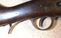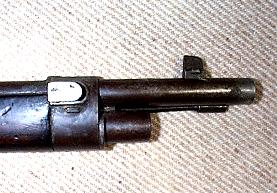 The barrel and front band of the 1886/89, note the tubular magazine protruding from the stock.