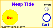 When the Moon is located at right angles to the Earth-Sun line, the Sun and Moon interfere with each other in producing tidal bulges and tides are generally weaker; these are called neap tides. |