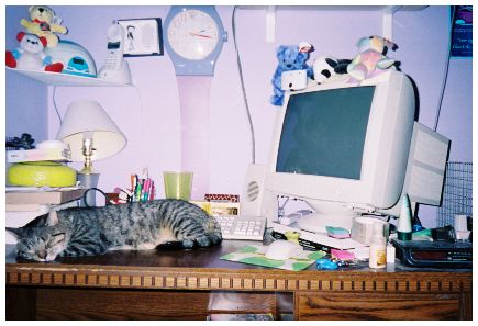 Again, lounging, this time on the desk before we rearranged it. He still has room to lounge with the new computer and all but how much cuter can he get?! *laugh*