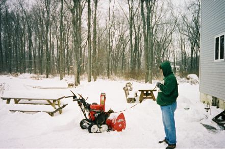 Datsun outside on his leash inspecting the snow blower and all the snow we got!
