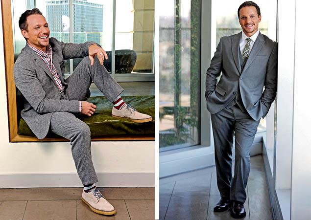 Left: Blazer, $225, and pants, $115 both by Shades of Grey by Micah Cohen at Bloomingdale's, 1000 3rd Ave. 212-705-2000. Shirt, $185 at Thomas Pink, 520 Madison Avenue. 212-838-1928. Shoes by J Shoes, $125 at amazon.com. Socks, $12 at richer-poorer.com. Belt, $48 at kennethcole.com.