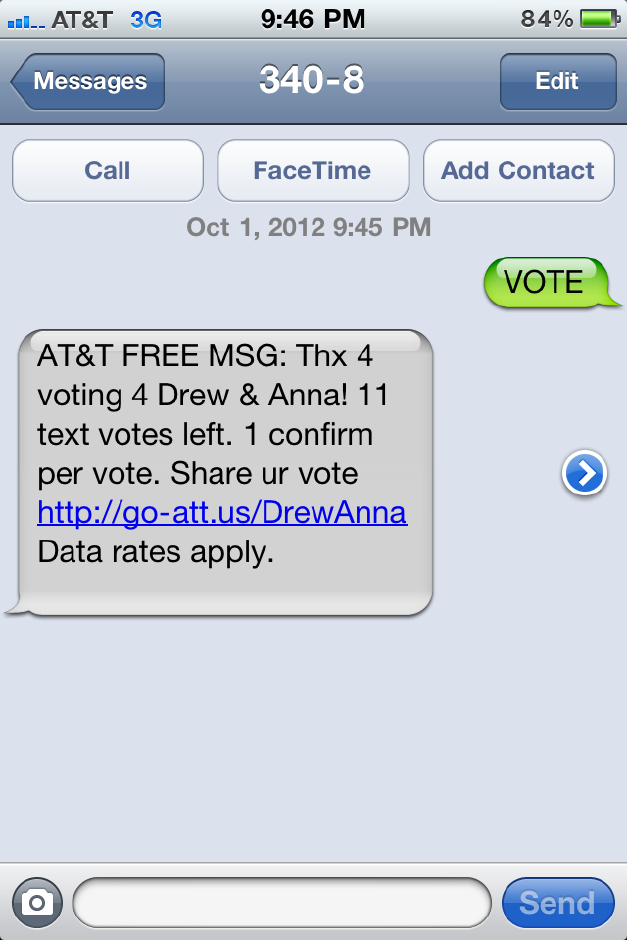To vote by text (AT&T only) text the word VOTE to the last four digits of the phone number. For example: to vote for Drew and Anna text "VOTE" to 3408. Easy!