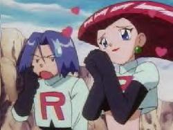 And just recently, there has been a lot of sources outside TV that hint at Jessie and James' relationship. I've heard that in the Pokemon 2001 calendar, Valentine's day is deicated to--you guessed it!--our heroes! AND, for those of you who've played "Pokemon Puzzle League," there's a few hints in a particular section where you battle TR. The levels feature their most memorable disguises which inludes the infamous wedding outfits!!!! You also get an added bonus of some very romantic Wedding March music playing in the backgorund. I almost cried at the beauty of it all. Then the puzzle blocks got higher and higher, and then Jessie and James starte cackling evilly...so it sorta ruined the mood. ^_^