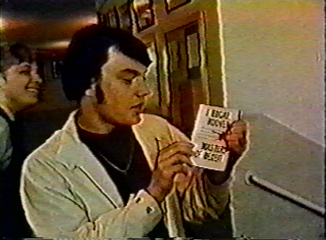 19, verse 14; let's bow for a moment of silent prayer ........ Amen. pbs06.jpg Jimmy Savely (displaying book; Roger Ferguson walks by in rear.): They've got this all wrong, ya see, uh, they misguided the cover somehow; and, they ought to cover this up, and then you cover up this 'S', and there it is as it should appear. pbs1js.jpg pbs2js.jpg pbs3js.jpg pbs10.jpg pbs09.jpg NEXT |