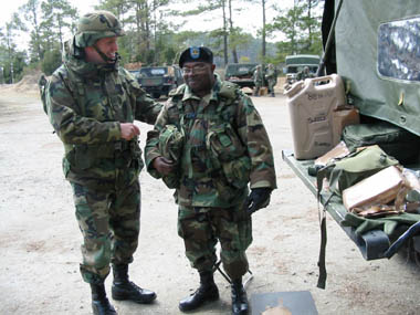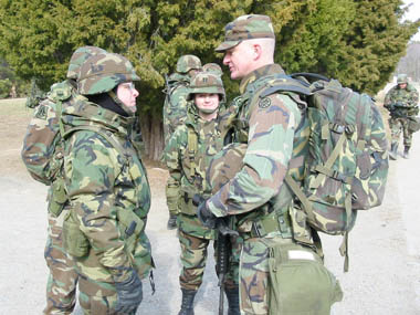 | Soldiers need to carry their world along with them. This young soldier is about 2/3 equipped. He is carrying a rucksack and a gas mask and has his kevlar helmet in his hand. He is speaking to MG Erck and I am taking the photo. | |
