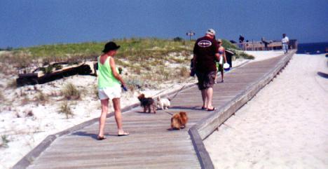 Beanie, Buttons and BabyBear with Paul and his Mom on the boardwalk across the dunes at Island Beach State Park.