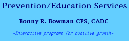 PREVENTION/EDUCATION SERVICES is a private enterprise created by Bonny R. Bowman, a professional with over 22 years of experience in the field of working with children, adolescents and adults. As a result, her work reflects expertise in treatment, prevention, crisis intervention and assessment of substance abuse and other issues. Teaching parenting skills is perhaps her strongest passion as the need for effective parenting skills are crucial, but don't always come naturally to many of us. |