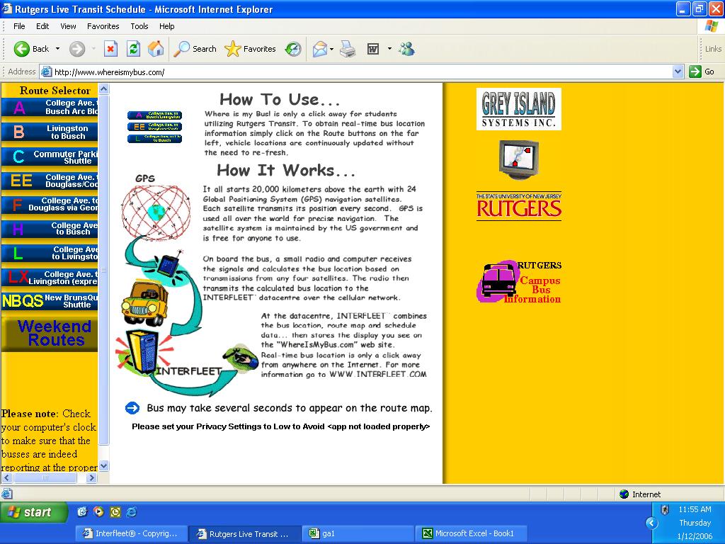 The information on Interfleet must be correct in order for the information to show up on whereismybus.com. In other words, if bus 1050 wasn't set to the F route on Interfleet (which Academy Express was solely responsible for), then it wouldn't show up at whereismybus.com. Similarly, if there were server/computer problems at the Interfleet end, then whereismybus wouldn't work either (or if Academy had computer problems, no updated information could go in~through). Like Nextbus today, if the buses weren't put on the correct route/job, then nobody's going to see it publically. The Interfleet site is still being used by dispatchers/management even after Rutgers transitioned from whereismybus.com to nextbus.com (as it's all done by the same company: Grey Island/Interfleet).