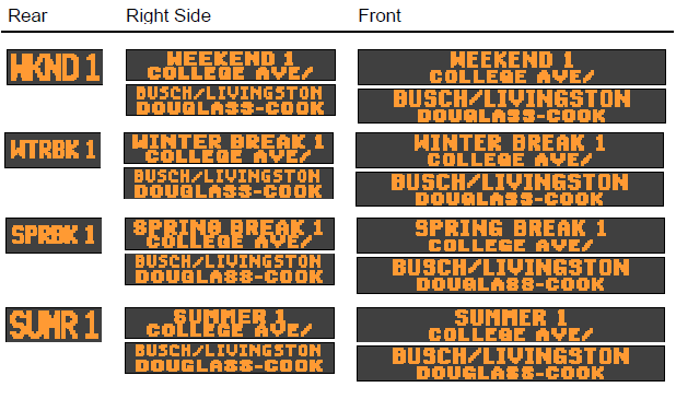 | Welcome to Gate B. You're here for information about the Rutgers Campus Bus Service, particularly during the weekends during the normal semester, weekdays during semester breaks, weekday during the SUMMER, and during special situations, right? |