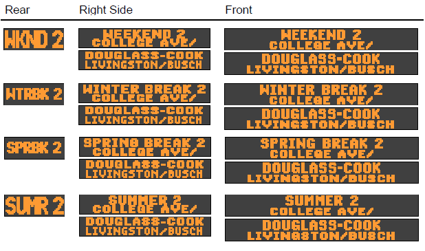 Normal Campus Bus Service until 8:00 PM. 8:00 PM to approx 2-3 AM: The Weekend 1 and 2 buses run on their normal Sunday schedules. New Brunsquick 1 Shuttle: Runs until 2:10 AM as normal. The NBQ2S ends early after 8 PM. |