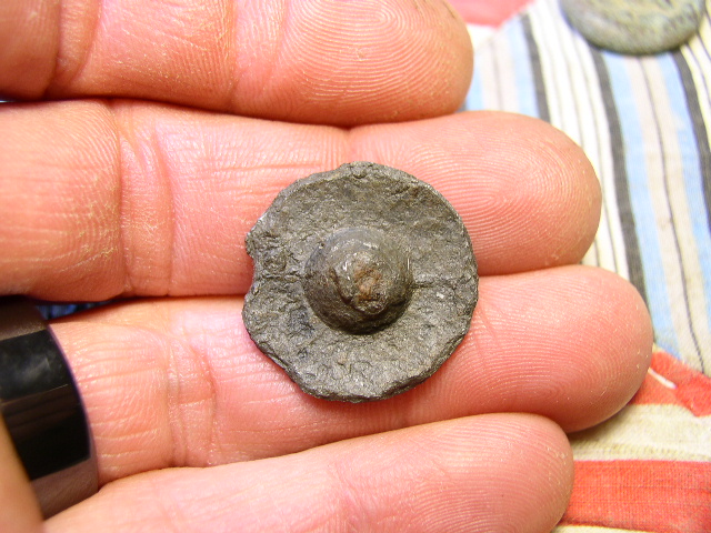 Very nice dug British Revolutionary War 21st Regiment of Foot enlistedman's, cast 1-piece pewter, coat button. The front features an incised crown above 21 above thistles. It is on a plain field. Pretty nice detail and a deep grey patina. The shank is missing from the reverse and the edge has some chipping. The pewter is super solid. $200