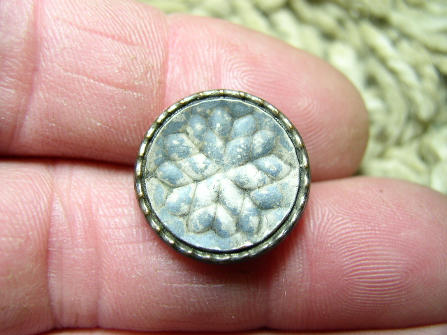 c.1765 Gentleman's coat or vest button. The front has a faceted geometric star, the spun bone back has original 18th century thread. This button has an uncleaned patina, is in good shape, and measures 18 mm's in diameter. $55