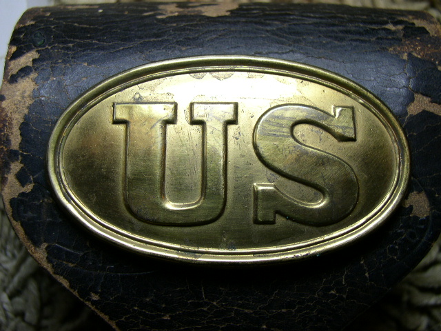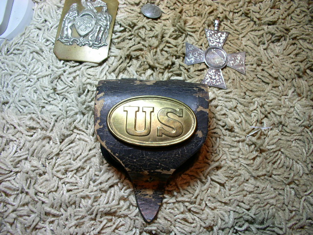 Good condition Civil War Union precussion capbox. Both leather belt loop attachments are present and solid on the reverse. Inner and outter flaps are present with the outter flap maker marked and inspected. The outer flap has a small US oval belt buckle attached to it. The box has some flaking and is untreated. $450