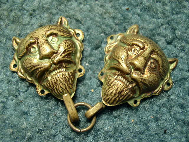 1850's stamped brass gargoyle or lion heads cape clasp. Each has a thick brass fastening bar lead soldered to the reverse. There is a brass ring attached to the one bar that the other grasps onto. There are four attachment or sew holes on each head. Remnants of old green paint on the uncleaned mellow patina brass. $125