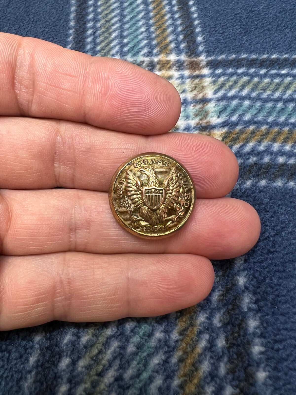 Rare Massachusetts Coast Guard 1861 coat button. It is listed in Albert's as MS 43 and in Tice as MS256. The front has a spread wing eagle surrounded by MASS COAST GUARD 1861. The front shows use wear. The reverse has a, c.1861, depressed D. EVANS & CO. * ATTLEBORO. MASS.* backmark. The shank is straight. This button measures 22.5 mm in diameter. $450