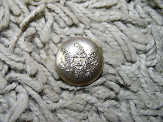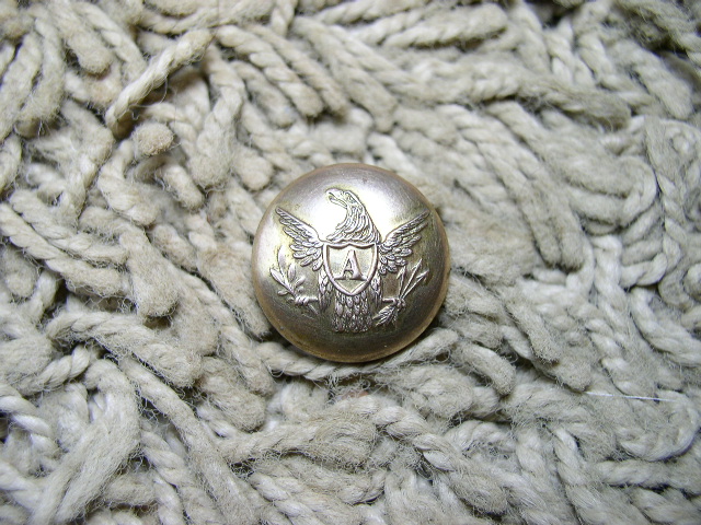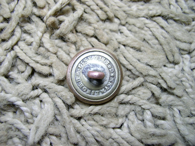Civil War artillery coat button. The front has a spread wing eagle with a capitol A. The reverse has an early RMDC W. H. HORSTMANN & Co FINE GILT backmark. The shank is straight. $40