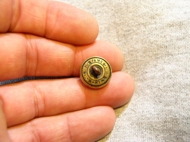 Nice non dug Union Civil War Massachusetts Independent Corps of Cadets cuff uniform button. It is a 2-piece gilt brass button. The front has a centered Old English ICC inside a wreath. The reverse has a small depressed, Wartime, D. EVANS & CO. SUPERFINE backmark. The shank is straight and the button measures 15 mm's in diameter. $24