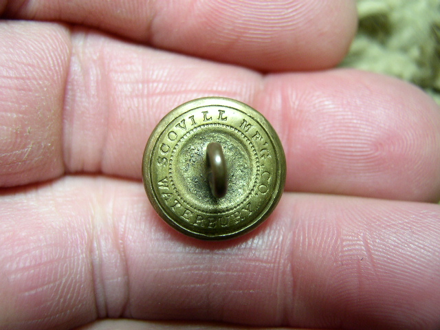 Non Dug Confederate Misouri state seal cuff or kepi button. It has a Wartime narrow rim and SCOVILL MF'G CO WATERBURY., outside a ring of dots, backmark. The shank is straight. The detail and gilt are very fine. It has no problems. $150