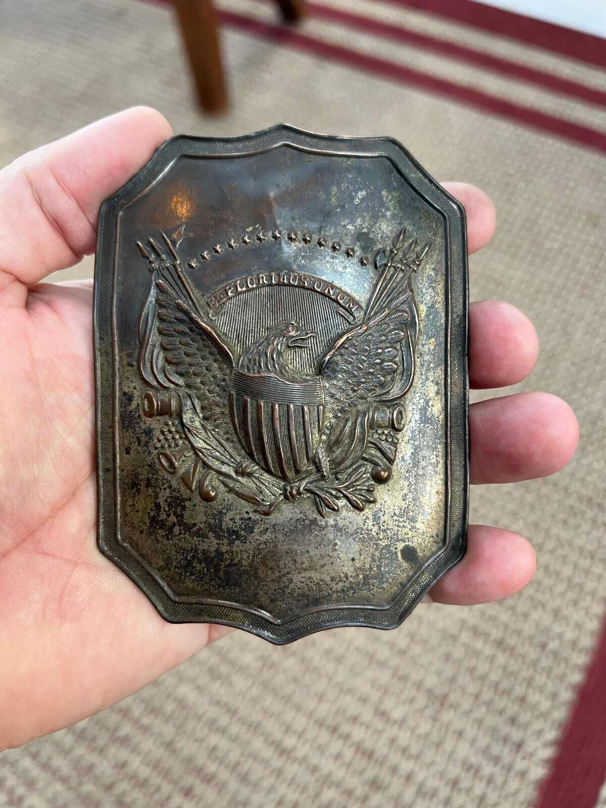 Large pre Civil War silver plated copper volunteer militia eagle cap or hat plate. It is an eagle with flags, cannons, 5-point stars, rifles, lances, and cannon balls plate with a fancy scalloped border. It has a great dark patina. These early plates were attached to the fronts of bell crown hats, tar bucket helmets, and other early militia headgear. The reverse has one of the original copper attachment loops soldered on. It never had a plume holder attached to it. It measures 3 1/4" x 4 1/2" in size. It has a couple bends from use. $635
