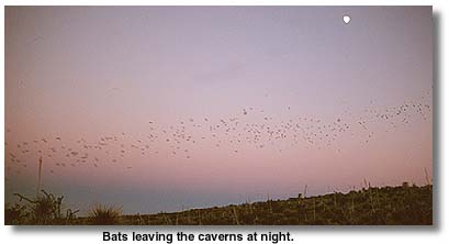 The evening flight of Mexican free-tailed bats (Tadarida brasiliensis mexicana) from the entrance of Carlsbad Cavern is one of the park's principal visitor attractions. Free-tailed bats are a colonial species that feed entirely on insects. The colony at Carlsbad is comprised primarily of females who give birth to their young from June through July before migrating south in October to winter in Mexico.