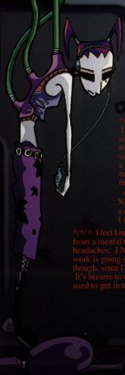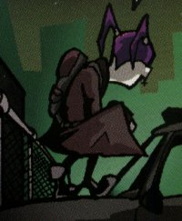 Appearance: Hair died purple, tattoo of a 5 on her right hand between the thumb and pointer finger. Hair often in pigtails bangs in her eyes. Here stare is cold with and underlining Venomous glint to it. She applies make up to her pale skin to make her seem paler and expertly smears smoky eye shadow across her lids, such as to hide who she really is. Crrys miltry issued messngerbg nd combtboots the rest of her clothing firly informal oftin tank top and Baggy jeans.