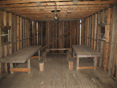 This is an interior shot of the mess hall showing the wooden tables where many meals were likely served.