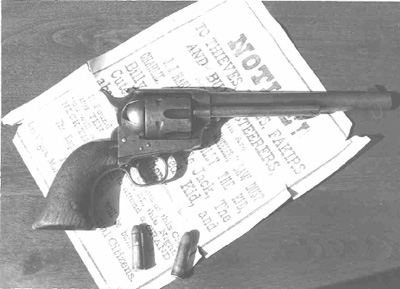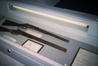 These are photos of Bob Ollinger's famous Whitney 10-guage double barrel shotgun, Billy the Kid's 1873 Winchester rifle, and Pat Garrett's .44 colt revolver that he killed Billy the Kid with on the night of July 14, 1881. The shotgun is the very same one that Billy the Kid shot Bob Ollinger with during his escape from the Lincoln County courthouse on April 28, 1881. Be sure and notice that the wooden stock of the gun has been wired back together, because after Billy shot Ollinger he broke it. The Winchester rifle was supposedly taken from the Kid's belongings by sheriff Pat Garrett after he was killed on July 14, 1881. All of these guns are owned by a private collector.