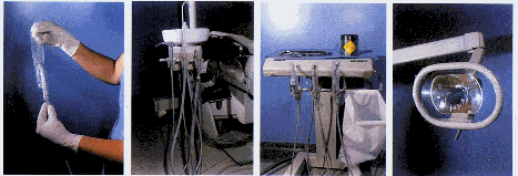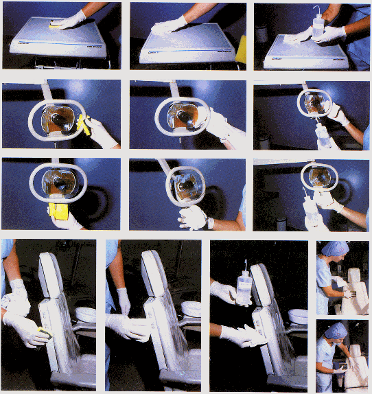 A mesa auxiliar, pontas, cuspideira, haste do refletor, cadeira, devem ser limpos empregando-se um desinfetante como o hipoclorito de sódio a 1%, após cada atendimento.