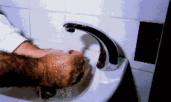 Molhar as mãos (de preferência torneira acionada pelo pé, cotovelo ou fotossensível), sem encostar na pia.