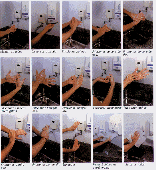 Dispenar o sabão anti-séptico nas mãos em quantidade suficiente para as mãos e antebraços, Iniciar a fricção das mãos em todas as suas faces, espaços interdigitaís e antebraços.
