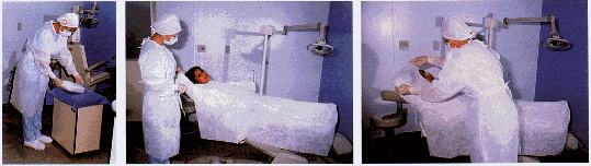 O paciente deve entrar na sala já com gorro e propé. Colocar avental longo.