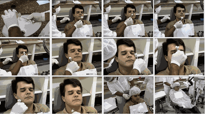 Figura-19: Anti-sepsia extra oral iniciando pela boca e ampliando em movimentos circulares passando por lábio superior, inferior bochecha, nasal, mento, masseterina, frontal e submandibular, colocação de campos esterilizados no paciente (cabeça e peito).