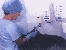 Figura-14: Seqüência do anti-sepsia dos mãos, utilizando escova descartável de dupla face (cerdas e esponja embebido com sabão anti-séptico: Escova, macia que contém degermante, espátula para remoção de sujidade dos unhas, escovação das unhas escovação dos dedos e palma da mão, fricção dos dedos e dorso da mãos, fricção do punho, fricção do antebraço, repetir procedimento no outra mão, começando pelas unhas, escavação, palma da mão, escovação, dorso da mão, fricção de antebraço, enxague com água corrente, não encostar na pia ou torneira, remover bem o resíduo de sabão no sentido dos dedos até o cotovelo, secagem, usar a compressa de fama que o lado usado não contamine a mão a ser enxugada.