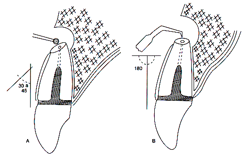 Figura 1: A)Ângulo de 30º a 45º para preparo com brocas, B) Ângulo de 180º para preparos com ultra-som.