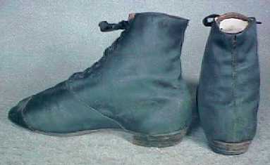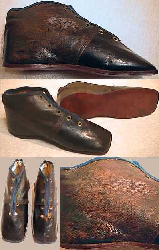 A terrific pair of children's black leather shoes with wide square toes. The front half of each shoe is of shiny patened leather, while the back is of black leather with a lightly embossed cross-hatched design. Shoe openings are edged with a deep blue silk tape. There are 6 sets of brass grommets for lacing up the front opening of each shoe, and shoes are lined with fine linen. No rights or lefts.