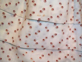 Ivory cotton play dress with rows of tiny red dots. Short straight sleeves with self-fabric ruffle. Piped sleeves and waist. Back button closure. Handsewn. Gathered bodice is lined in a heavy cotton. Hem faced with heavy cotton.