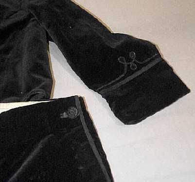 Condition: Jacket: Excellent. Knickers: velvet faded where sat upon, velvet has many small stains, braid on right side is torn in two places, Dorset buttons on knee buckles and just above show wear.